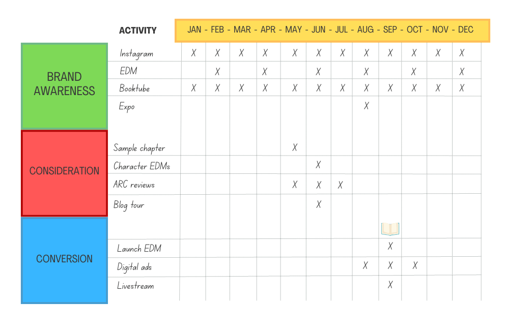 You create a timeline that factors these 3 phases in. You decide what activities will have the most bang for buck for each phase, you line it up on a timeline, and you give it a crack! In terms of planning, below is what I have created for my debut novel to help me plan out the phases step by step. You’ll note that brand awareness activities don’t ever really end: